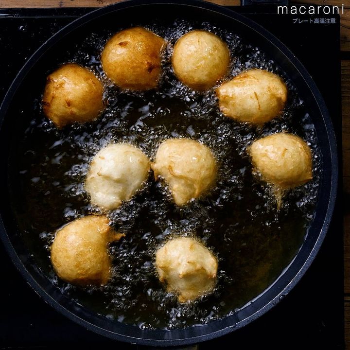 5: スプーンでひとつ分取って丸めたら、160℃の油できつね色になるまで揚げます。