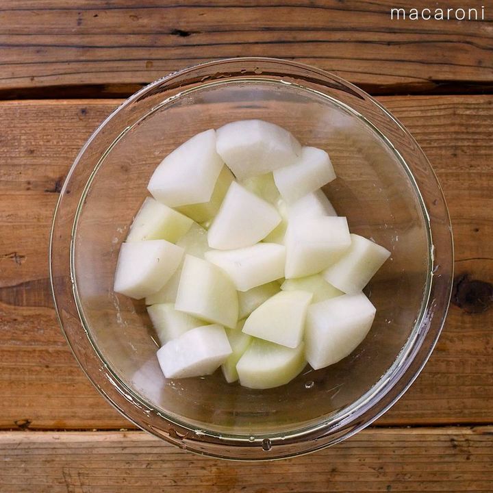 2: ボウルに大根、水(大さじ2杯)を入れ、ラップをかけてレンジ600Wで6分加熱します。