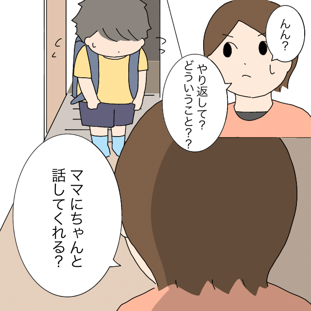 そして、「んん?」ケンゴ君の言葉を聞いて「やり返して?どういうこと??」おかしいと思ったあかねさんは、「ママにちゃんと話してくれる?」そう言ってケンゴ君の話をはじめからよく聞いてみることにしました。