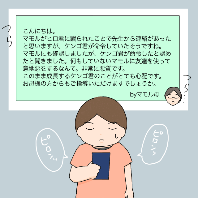 「マモル君ママ:こんにちは。マモルがヒロ君に蹴られたことで先生から連絡があったと思いますが、ケンゴ君が命令していたそうですね。マモルにも確認しましたが、ケンゴ君が命令したと認めたと聞きました。何もしていないマモルに友達を使って意地悪をするなんて非常に悪質です。このまま成長するケンゴ君のことがとても心配です。お母様の方からもご指導いただけますでしょうか」長文のメッセージが届きました。