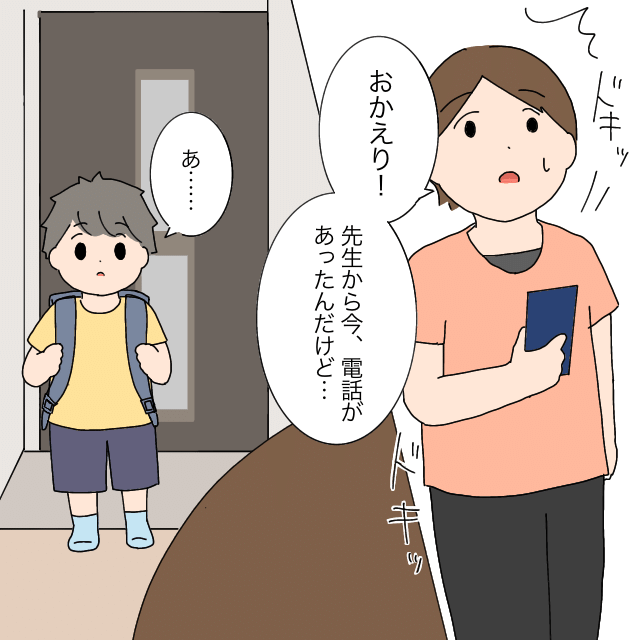 ケンゴ君の声にビックリしたあかねさんは、「お、おかえり!先生から今電話があったんだけど・・」と帰って来たばかりのケンゴ君に言うと、「あ・・・」と玄関先で立ち尽くしてしまいました。