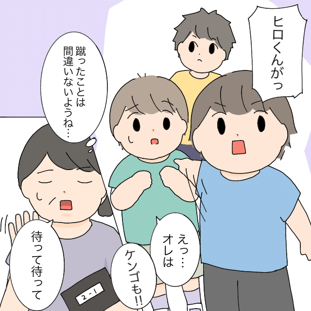 「ヒロ君がっ!」とマモル君がヒロ君を指差すと、「えっ・・オレは」と否定しようとすると「ケンゴも!!」と言い出すマモル君、先生は「蹴ったことは間違いないようね・・」と思い、「待って待って」と声をかけました。