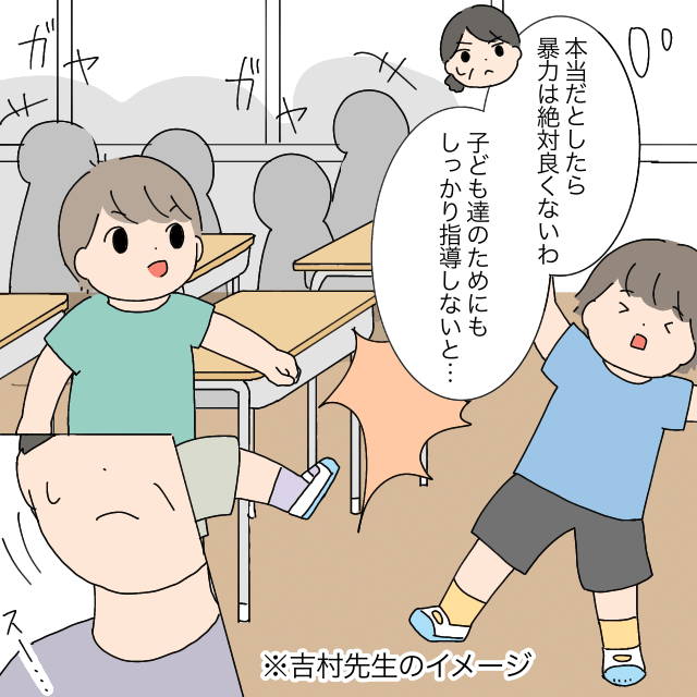 そして、「本当だとしたら、暴力は絶対良くないわ。子ども達のためにもしっかり指導しないと・・」トラブルを想像し、指導について考えていた吉村先生。