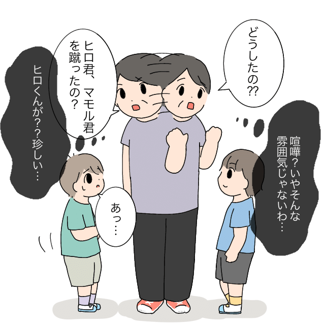 「どうしたの??」「ヒロ君、マモル君を蹴ったの?」「あっ・・」ヒロ君とマモル君に声をかけながら、「ケンカ?いやそんな雰囲気じゃないわ・・ヒロ君が??珍しい・・」と先生はいろいろと考えていました。
