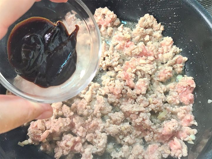 2. ひき肉が白っぽくなり脂が出てきたら甜麺醤、豆板醤、豆豉醤(今回は赤みそで代用)を加えて炒めます。