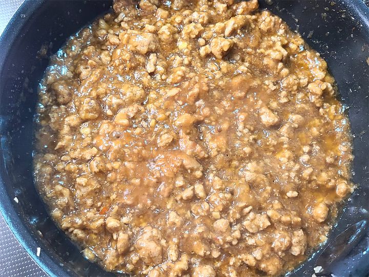 3. 香りが立ってきたら水としょうゆ、水溶き片栗粉を加えて煮立ててとろみをつけ、火を止めます。これでソースは完成です!