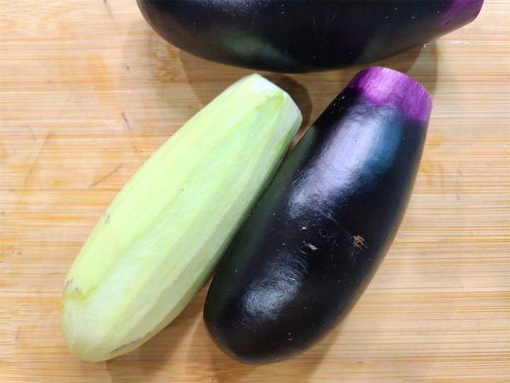 4. なすはヘタを落とし、皮をピーラーでむき、水に5分ほどつけてアクを抜き、水気を軽く拭きます。