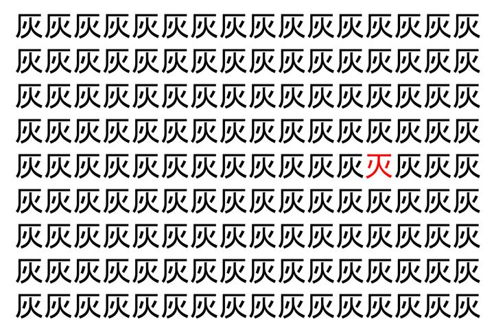 2. 【脳トレ】「灰」の中に紛れて1つ違う文字がある!?あなたは何秒で探し出せるかな??【違う文字を探せ!】
