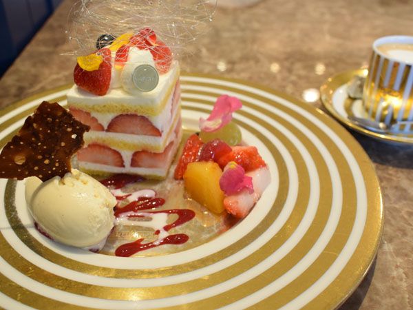 カファレルのカフェで人気のショートケーキは旬のフルーツが使われるため、季節ごとに果物が変わります。訪問時はいちごでした。 ケーキを店内で食べる際は「特製お皿盛り」(単品 1540円/ドリンクセット 1980円)で提供されます。繊細な飴細工や食べられるお花が華やか! 家具や内装、食器やカトラリーなど、上質さが感じられてとても優雅な気持ちになれます。