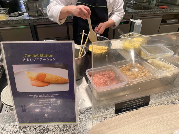 富山名物を取り揃えるとなると和食が多くなりがちですが、ホテルの朝食ビュッフェらしく洋食も種類豊富にラインナップ。オムレツステーションでは、好みの具材を伝えると、目の前でオムレツを調理してくれます。サイズや焼き加減の細かなリクエストにも応えてくださいました。