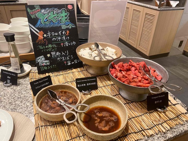 「とやまコーナー」では、ホタルイカの沖漬けや昆布かまぼこなどを用意。ホタルイカの沖漬けはとくにお土産として持って帰るのは難しい場合もあるので、ぜひこの機会に堪能してみてください。少し大ぶりでプリップリ!お箸が進みます。