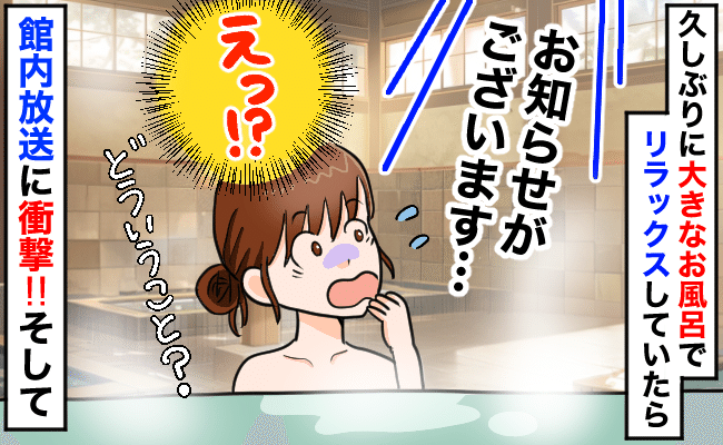 私と夫、4歳の息子で温水プールがあるアミューズメント施設へ遊びに行ったとき。プールで遊んだあと、入浴をして帰ろうということになりました。湯船でリラックスしていると館内放送が聞こえてきて……。