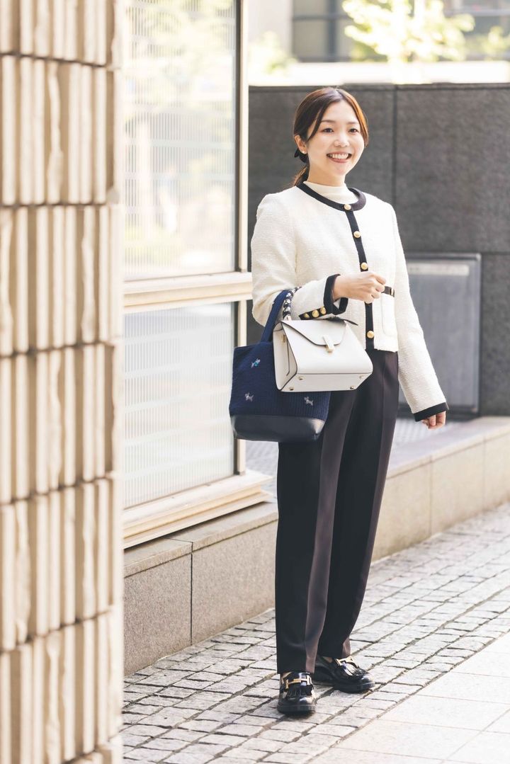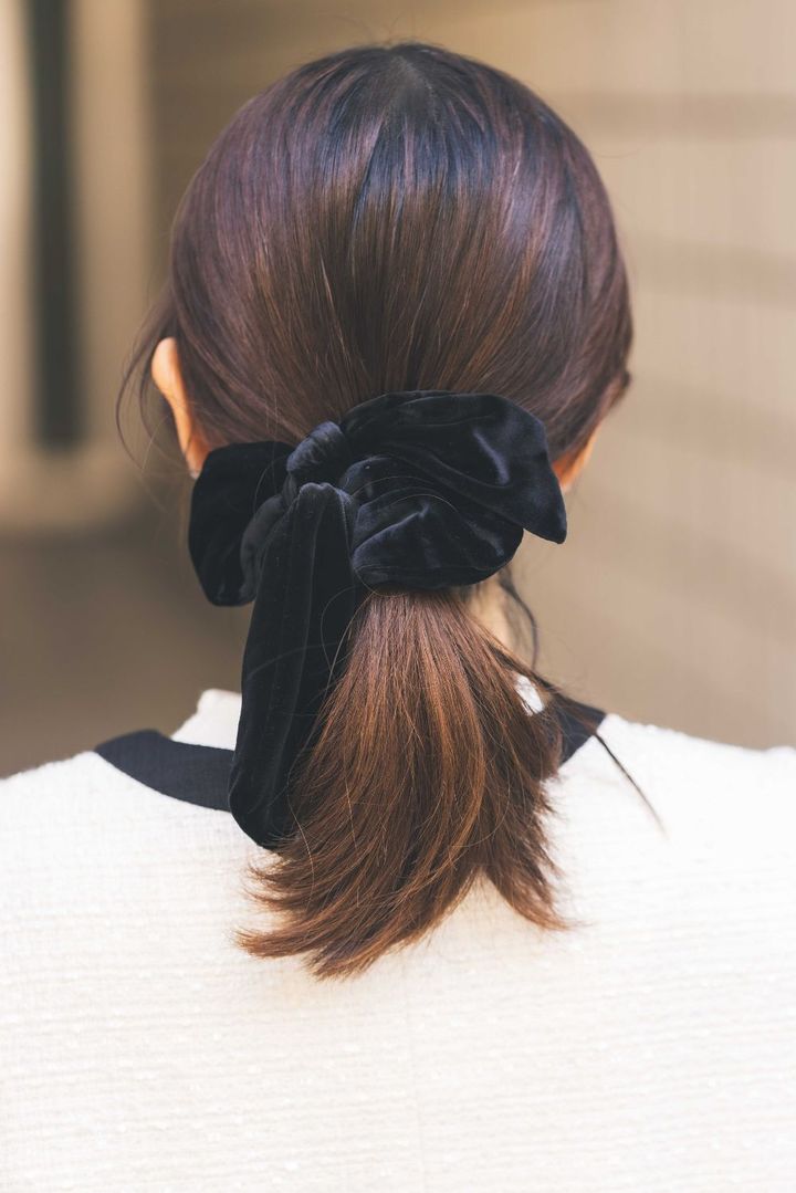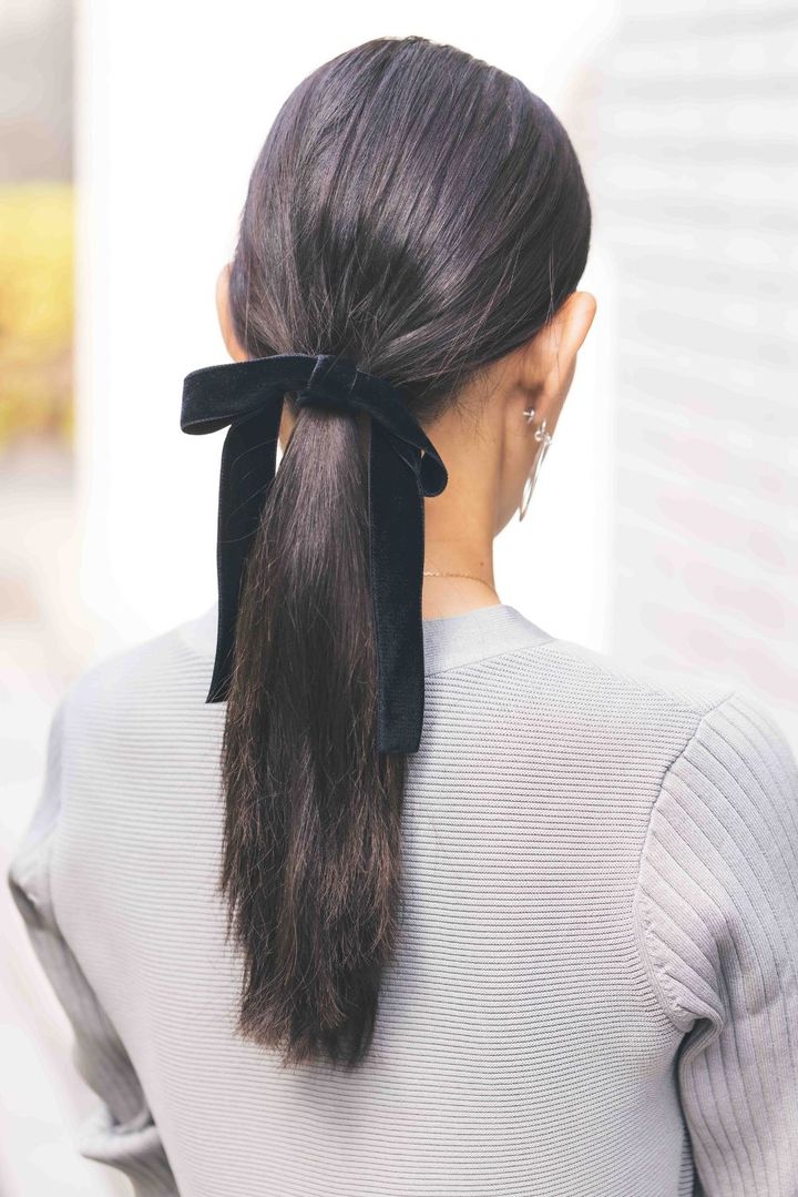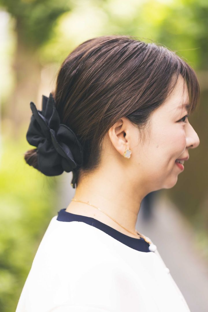 「ボリューミーなリボンが存在感抜群のヘアアクセが最近のお気に入り。低めの位置で一つにまとめるときは、結ぶだけで完了するヘアアクセをつけてこなれ感が出るようにしています。シンプルなスタイルだからこそ、前髪は必ずヘアアイロンで巻いてキレイに見えるように気をつけています」鷲尾みなみさん・35歳(2歳の男の子ママ)