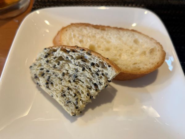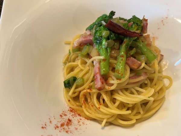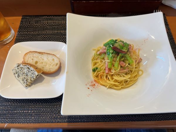 にんにくがしっかりと効いたベーコンと菜の花のペペロンチーノ! 自家製パンもついています。見た目にもきれいで美味しそうですね! 生パスタだけあってモチモチとした食感でとっても美味しい! パンとの相性も良くこちらもペロッとたいらげました。
