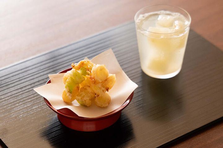 お酒は口の中の油をリセットしてくれる柑橘果汁のサワーがお薦めです。通常は柑橘を搾り入れますが、こちらは柑橘果汁をシリコンの製氷器に入れて凍らせた柑橘氷。こうすると時間が経ってもサワーが水っぽくならずにすみます。柑橘がたくさんあるときにまとめてつくっておくと便利ですよ。