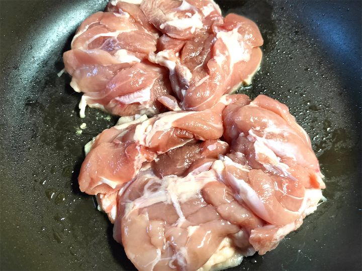 4. 別のフライパンにオリーブオイルを入れ、両面に軽く塩を振った鶏肉を入れて中火で炒めます。