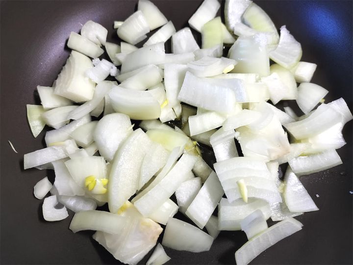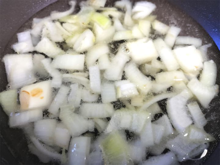 1. フライパンにオリーブオイルと玉ねぎを入れて、塩を振って軽く中火で炒めます。