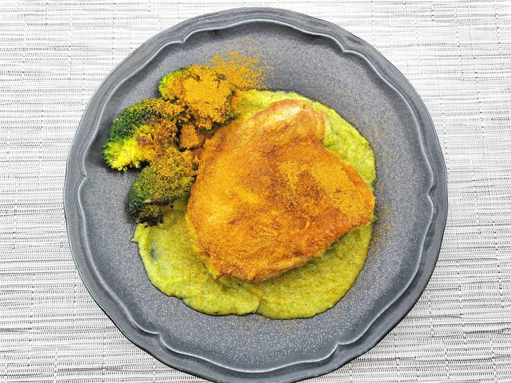 10. 器に9のブロッコリーペーストを敷き、9の鶏肉とブロッコリーを乗せて、カレー粉を全体に振りかけたら完成です♪