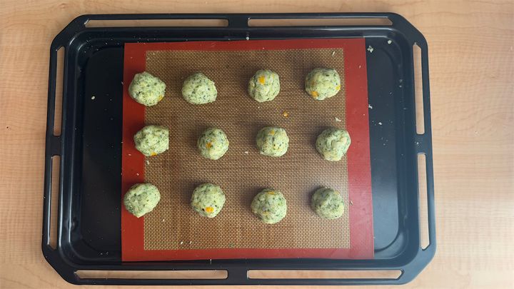12等分に丸め、オーブンシートをしいた天板に並べる。180℃のオーブンで14〜15分焼く。