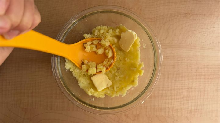 1. じゃがいもは皮を剥いて一口大に切り、耐熱ボウルに入れる。隙間をあけてラップをかぶせ、600Wの電子レンジで3〜4分じゃがいもが柔らかくなるまで加熱する。有塩バターと塩を入れ、熱いうちにマッシャーで潰す。