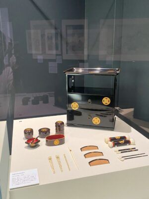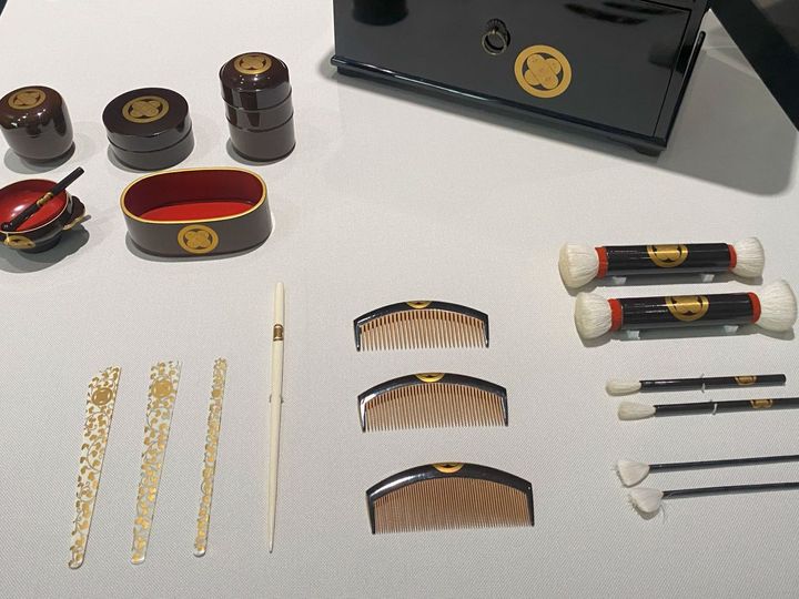 江戸時代後期に使われていた、紋の入った漆塗りの化粧道具も展示。象牙製のヘラなどを使って、眉を描いていた 。Harumari Inc.