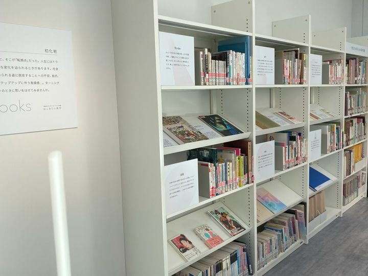 連想が広がる「Books」エリア。今回の展示をテーマにした、ユニークな選書に心躍る。Harumari Inc.
