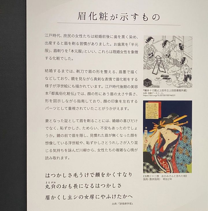 他にも、未婚・既婚女性の装いを描いた浮世絵作品や、眉にまつわる川柳、上流階級の眉化粧の紹介も。「眉化粧」をさまざまな切り口から考えることができる。