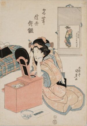 江戸時代、庶民の女性は出産すると、 眉を剃り落として描かないまま過ごした。この習慣が「剃り眉」だ。そこには、「慎ましく、表情をあらわにしない」という心構えが込められていたという。つまり、眉化粧は若いうちだけの期間限定のもの。五渡亭国貞の『名筆浮世絵鑑』は、女性が真剣に眉化粧する様子を描いた作品だ。