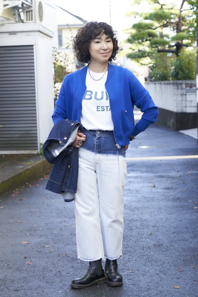 「お気に入りのバーバリーのメンズロゴTを、きれいめに見せたくてブルー系でまとめました。冬は暗めのカラーになりがちなので、Tシャツのロゴと同系のきれいなブルゾンをトップスに」と浅野さん。ショート丈のニットブルゾンと白Tのコントラストの縦ライン効果で、スタイルアップ。さらに「淡いブルーのデニムは、はき心地がいいうえに、気になる腰まわりが濃色のインディゴのツートーンでスリムに見せる効果があります」。クロップト丈のデニムに黒のかっちりブーツで足元を締めて。じゃらりとつけたゴールドとシルバーのリングとバングルが、華やかなアクセントに。