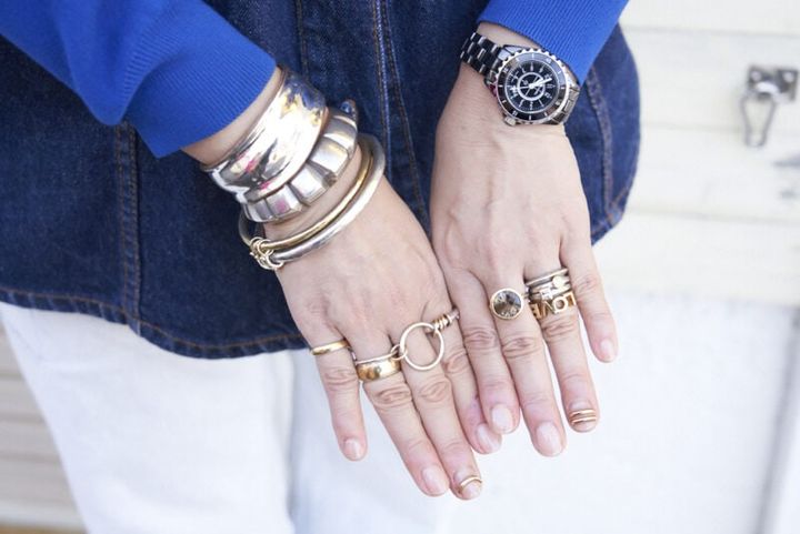 右腕にはマルコムベッツのボリューミーなブレスレットを重ねづけして、指にもゴールドのデザインリングをたくさんつけるのが、浅野さん流。「リングやブレスレットなど、ボリュームがあるアクセサリーが好きなので、ハードさと女性らしさのある黒のシャネルの時計を7、8年前に買いました。元が取れるほどヘビロテしていて、後で白も買い足したほど気に入っています。どちらもコンディションのいいものをリサイクルショップで購入しました」(浅野さん)
