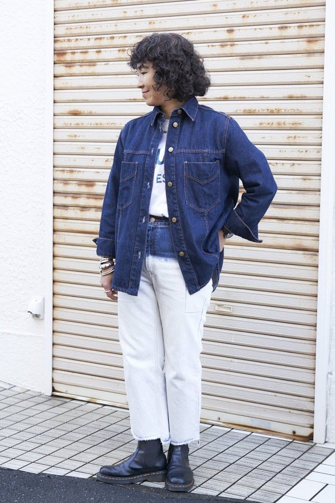 切りっぱなしクロップト丈のデニムに、ドクターマーチンのサイドゴアブーツで足元はハードに。デニム丈がくるぶしの上にくると、抜け感ができます。
