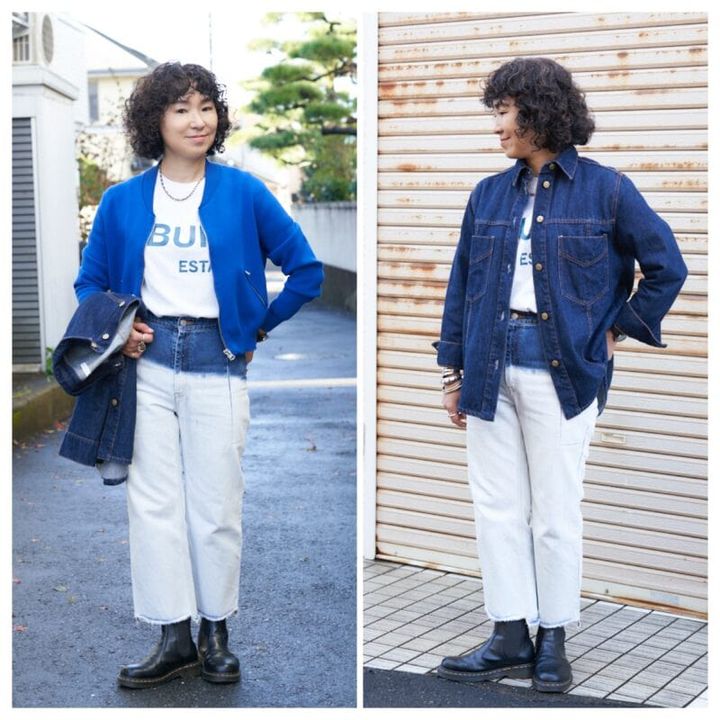 アウターには、ザラのデニムコートをはおって。きれいめデザインながらも、ヒップラインが隠れるサイズ感と軽やかさで、ニットブルゾンの上にはおっても窮屈になりません。ブルーと淡い色のコントラストで全身をすっきり見せてくれます。「おしゃれのコツは、ベース色(このコーデではブルー)に、1~2割ほどほかの色(このコーデでは白、黒)を使うことです」と浅野さん。また「ブルーは大人が取り入れやすい色」とも。大人のデニムスタイルのお手本になりそうです。