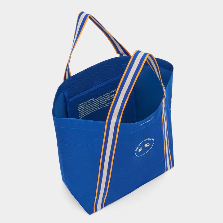 2021年の本国・イギリスでの発表以来、スーパーマーケットとのコラボレーションという形で発売されてきましたが、今回は初のオリジナルバージョン。チョコレートカラーのベースにブルーストライプがポイント。しかも、レギュラー・サイズだけでなくミニ・サイズとのセットになっているので、スーパーならレギュラー近くのコンビニならミニと使い分けることもできそう! 『Universal Bag』アニヤ・ハインドマーチ・セット[レギュラー:H40×W35×D19cm、ミニ:H24.5×W21×D11cm]¥5,940(アニヤ・ハインドマーチ)