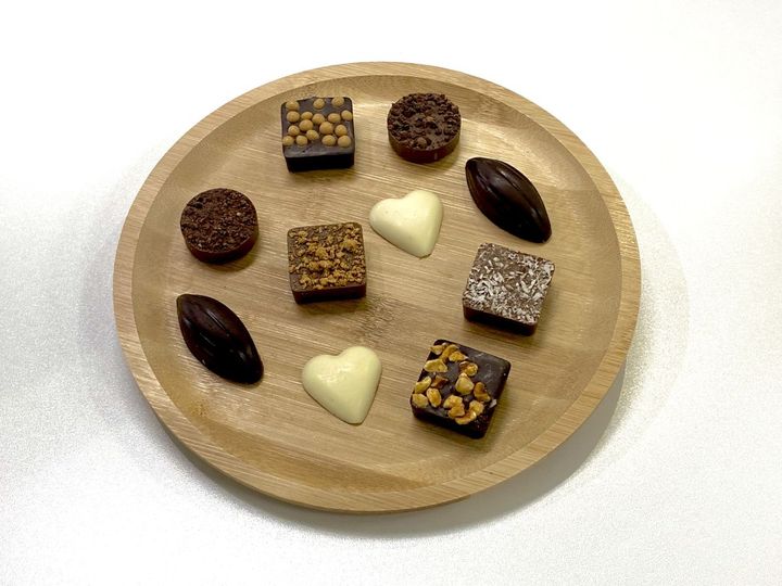 「カラティール」からは、カカオハスク(カカオ豆の種皮)でスモークしたアーモンドのプラリネと、キャラメルとウイスキーのガナッシュで構成したショコラ。「ショコラティエ パレドオール」からは、アーモンドとバニラの香りの自家製ホワイトチョコレートガナッシュに、マカダミアナッツの食感がアクセントになったチョコレートがイン。
