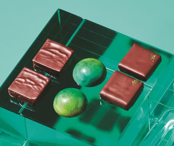 フレッシュな素材感が際立つさわやかな味わいの「レモングラス&ペパーミントガナッシュ」、自家農園で栽培したアーモンドを使った「クリスピープラリネ」、そしてパトリック・ロジェ氏の代名詞ともいえるドームは、M.O.F.(フランス国家最優秀職人章)を取得した際に生まれた甘酸っぱい「ライムキャラメル」。