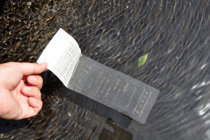 参拝所の横には社務所があり、各種お守りなどのほか、御朱印帳や絵馬などをお授けしていただけます。なかでも注目はおみくじ。大吉以外の場合、「神徳稲荷神社」のおみくじはなんと、境内にある池で水に流すのです。水に溶ける仕様になっているので、心配いりません。するすると溶けていくおみくじ。紙が溶け文字だけが浮かびあがるのが神秘的です。