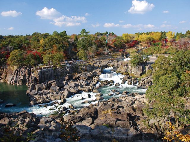 「曽木の滝(そぎのたき)」は、滝幅210m、高さ12mにも及ぶ雄大な滝。「東洋のナイアガラ」ともよばれ、夏の水量は豪快そのものです。付近一帯は公園になっていて、春は桜やツツジが彩りを添えるほか、秋には巨岩と紅葉の織り成す素晴らしい景観が楽しめます。