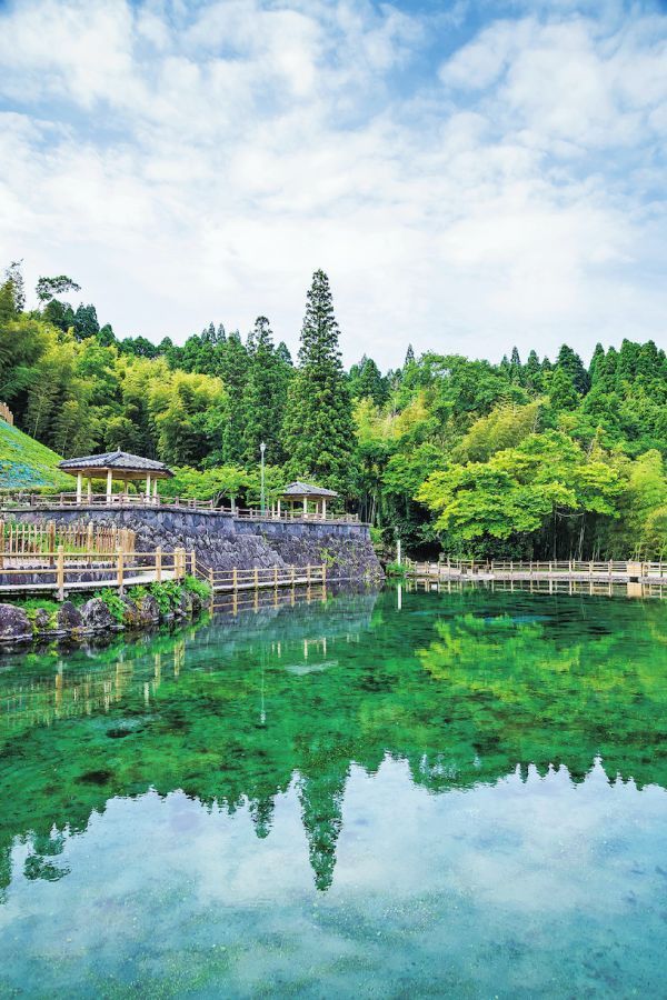 霧島山麓に湧く『日本名水百選』の一つに選ばれている「丸池湧水(まるいけゆうすい)」。一日約6万tの水量を誇り、町の生活用水にも使用されています。周辺には石畳の散策路や水汲み場もあり、池の周りを散策するのもおすすめ。春はソメイヨシノの名所、夏には池に集まるホタルの観賞スポットとして賑わいます。