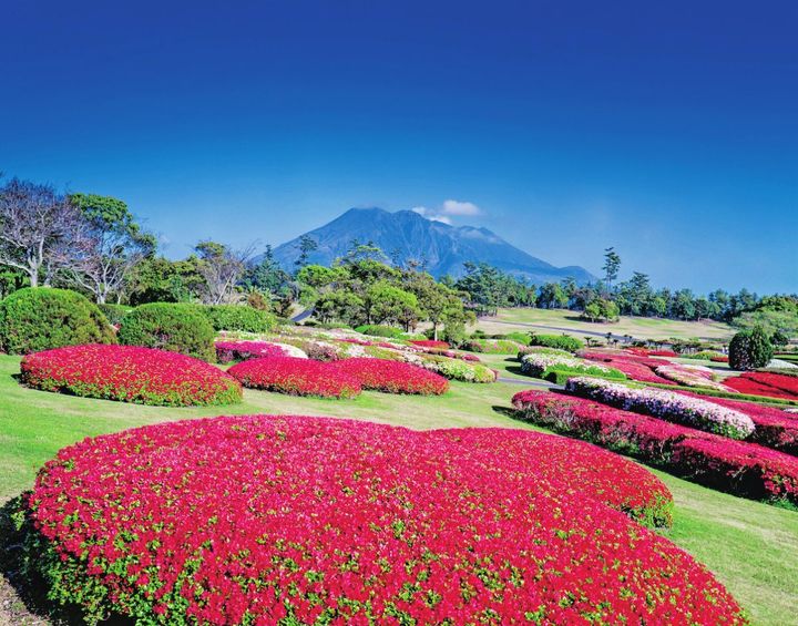 鹿児島市中心部の北東の高台に位置する自然豊かな「鹿児島県立吉野公園(かごしまけんりつよしのこうえん)」。「日本の都市公園100選」にも選ばれるこの公園内には、ツツジや桜をはじめ、季節ごとにさまざまな花が咲き誇ります。錦江湾(きんこうわん)を挟み、園内からは桜島を望むこともできますよ。