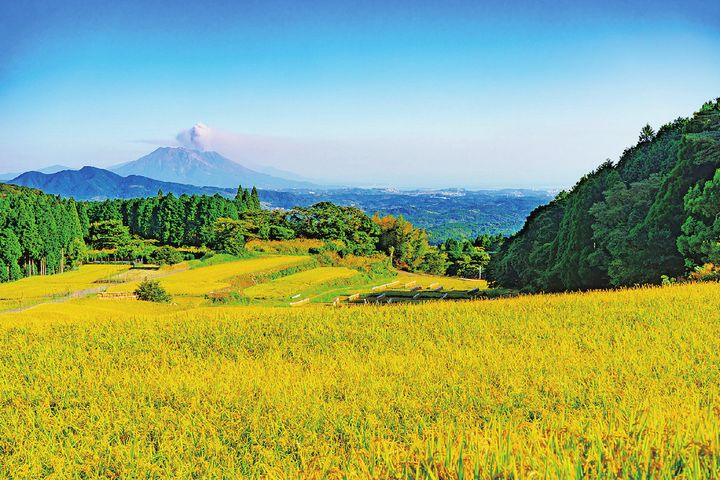 秋の刈入れ前は黄金色に実った稲穂が美しく煌めきます。遠景の桜島を背景に、ぜひ写真に収めてみて♪