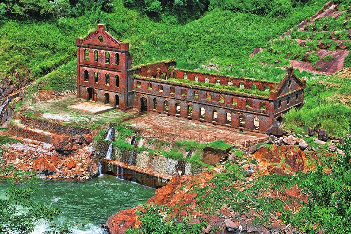 明治期に牛尾大口金山の電源供給のために造られた水力発電所跡。昭和40年(1965)にダム湖に沈み、現在は、5~9月の渇水期のみ姿を現します。