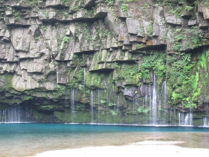 「雄川の滝(おがわのたき)」は、南大隅町・雄川の上流に位置する落差46m、幅60mの滝。駐車場から滝つぼまでの約1200mの遊歩道を行くと、不思議な形状をした壁面から流れ落ちる伏流水や、エメラルドグリーンに輝く滝つぼが見られる絶景にたどり着きます。遊歩道は勾配があるので、歩きやすい服装で出かけてくださいね。