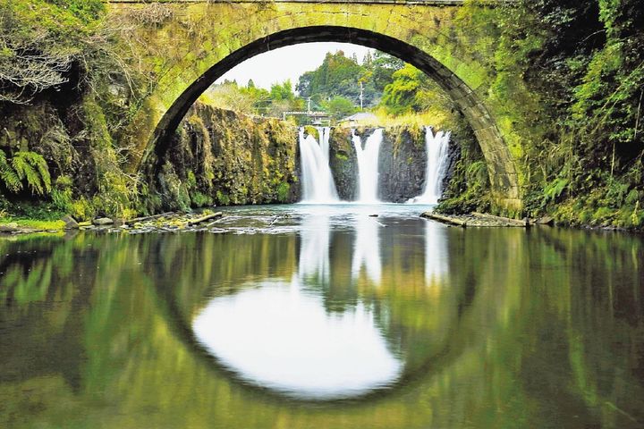 明治12~13年(1879~80)ごろに架けられた石橋「金山橋(きんざんばし)」。美しいアーチ型の橋と近くを流れる「板井手の滝」の姿が、ある角度から見ると「まるで万華鏡をのぞいているかのよう」とSNSでも話題に。