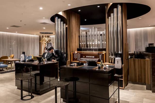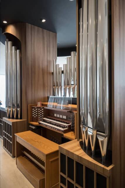 7階でエレベーターを降りると、目の前にパイプオルガンが出迎えてくれます。オルガニストでもあったJ.S. バッハをオマージュする設えです。