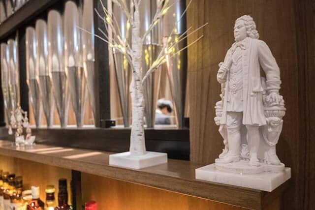 ロビーにある丸テーブルの上には金管楽器を組み合わせたオブジェが飾られ、J.S. バッハの楽曲カンタータ第214番「太鼓よ鳴れ ラッパよ響け」BWV214を思わせます。