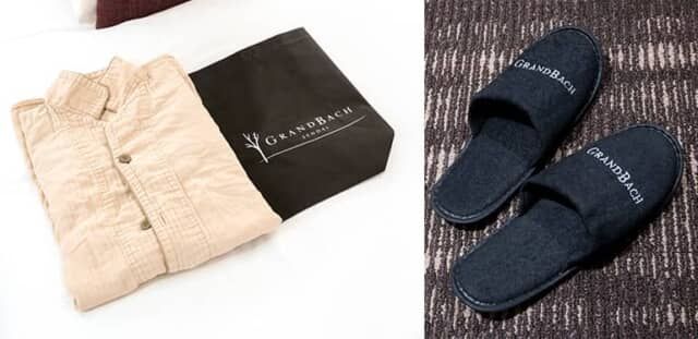 大浴場に行くのに便利な不織布バッグと、ホテルのロゴが刺繍されたスリッパを用意。どちらも持ち帰りが可能です。