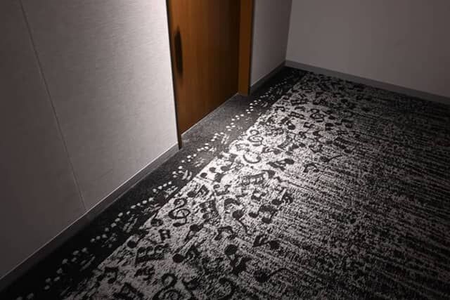 ▲客室階の廊下に敷かれたカーペットには音符が描かれます