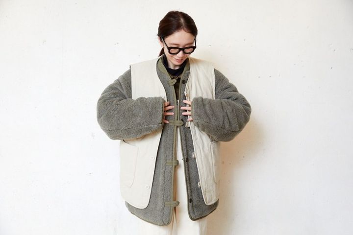 ジャケットとベストはどちらもリバーシブル仕様で、ジャケットはコットンナイロンを、ベストはフリースを表にして着用。