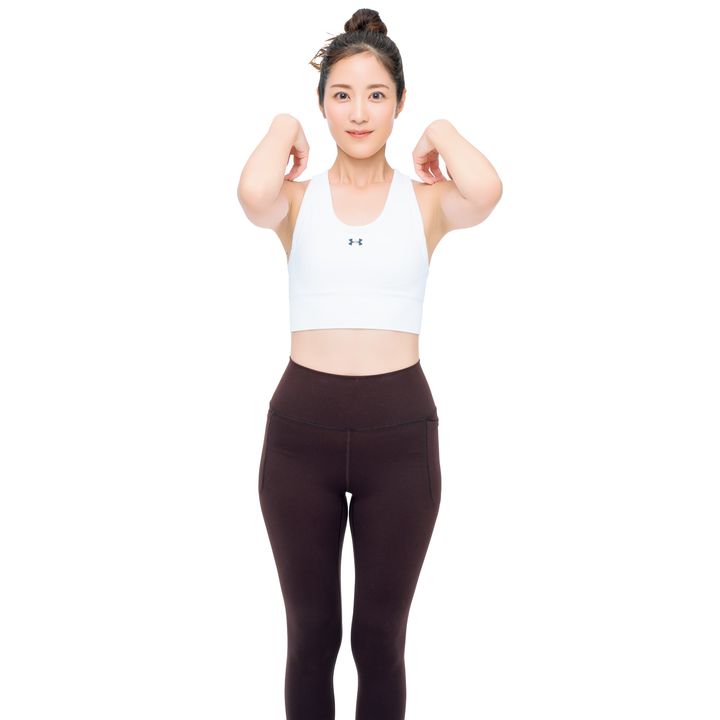 腕の重さを利用して、緊張して引き上がった僧帽筋をリラックスさせます。両肩にそれぞれの指先を軽く当てます。