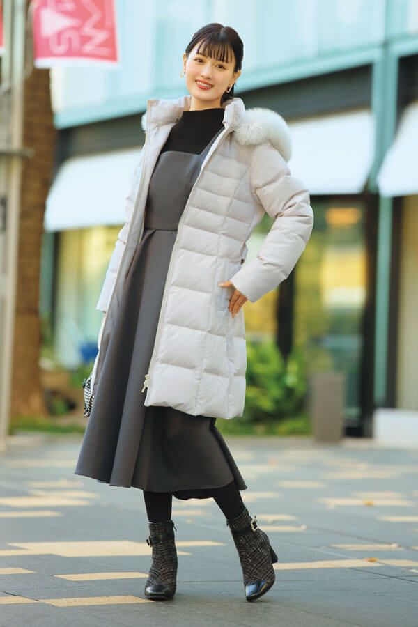 ダウンコート¥56,100/アプワイザー・リッシェ ニット¥9,790/Swingle(Swingle 有楽町マルイ店) ビスチェ&スカートSet¥13,970/リリアン カラット バッグ¥13,750/ダイアナ(ダイアナ 銀座本店) イヤリング¥6,050/フェリーチェ(ロードス) タイツ¥1,320/靴下屋(Tabio)